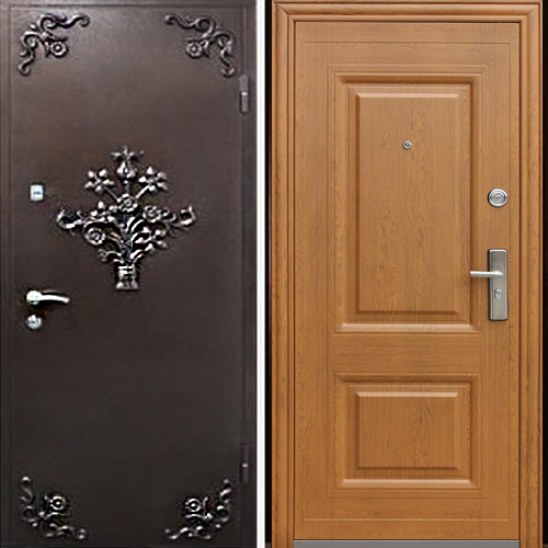 Стальная дверь с порошковым окрасом и ковкой с МДФ внутри — совмещает эстетичность и превосходные защитные характеристики.
